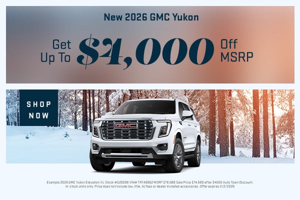 Example 2026 GMC Yukon Elevation XL Stock #G26096 VIN# TR149652 MSRP $78,589 Sale Price $74,589 after $4000 Auto Town Discount. In-stock units only. Price does not include tax, title, lic fees or dealer installed accessories. Offer expires 2/2/2026